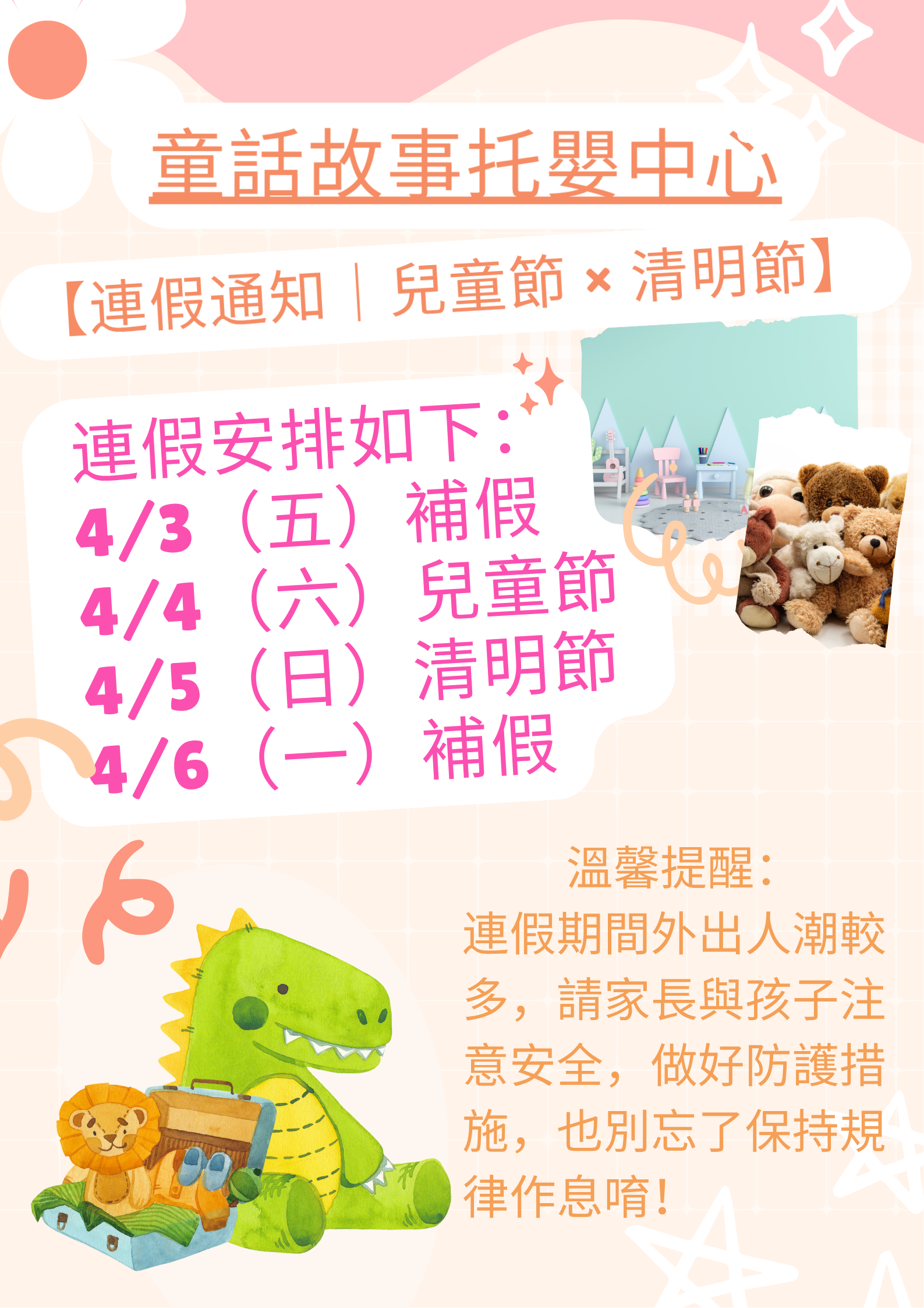 連假期間外出人潮較多,請家長與孩子留意安全,做好防護措施,並維持規律作息,讓寶貝們在假期中也能健康又開心地成長唷!